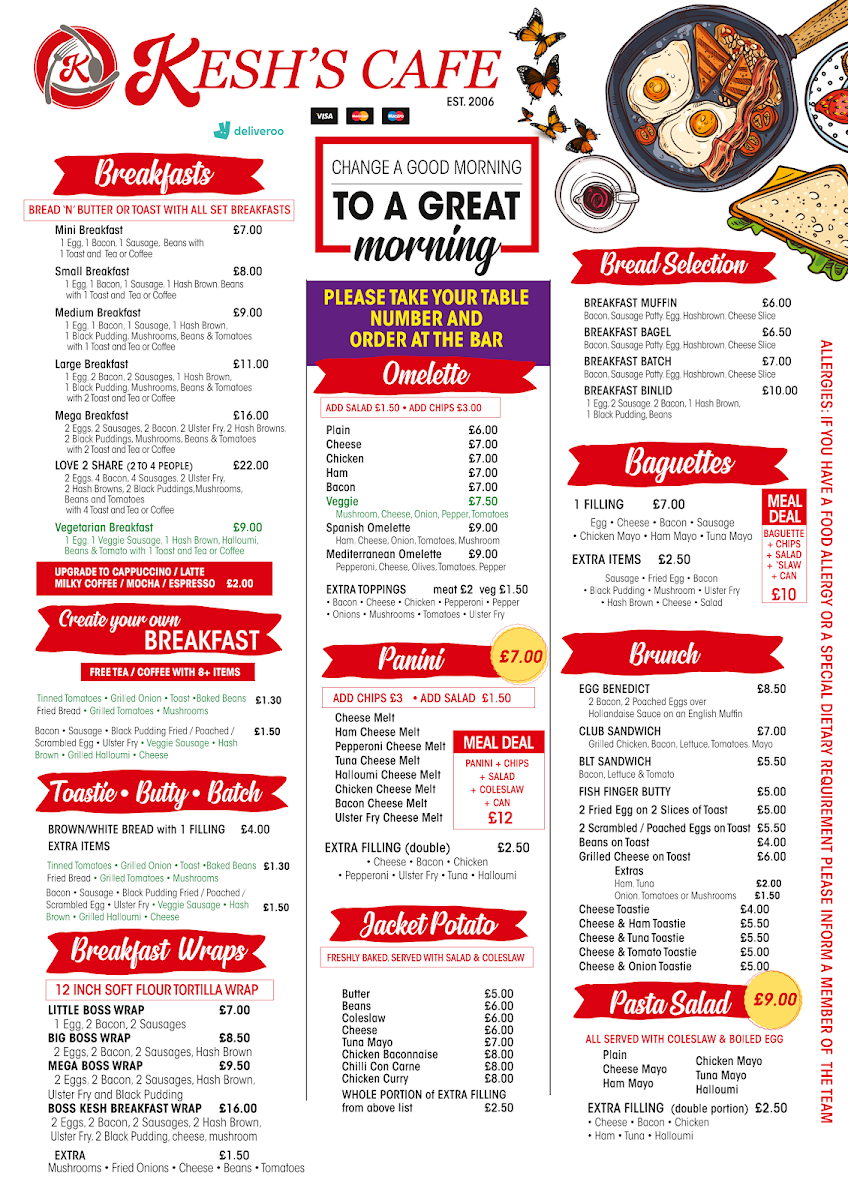 Overall, Kesh’s Cafe offers a varied and satisfying menu that caters to both classic breakfast lovers and those seeking hearty lunch options. The range of breakfasts-from the Mini Breakfast through to the indulgent Mega Breakfast-provides flexibility for different appetites, while customizable choices like the BREAKFAST MUFFIN, BREAKFAST BAGEL, and build-your-own breakfast items such as Tinned Tomatoes or Baked Beans add a personal touch. The selection continues to impress with comforting options like Cheese Melt Panini, Halloumi Cheese Melt, and brunch staples such as EGG BENEDICT and the CLUB SANDWICH. For something more filling, the LITTLE BOSS WRAP, BIG BOSS WRAP, and MEGA BOSS WRAP stand out, alongside satisfying mains like Chicken Schnitzel, Chips, Peas or Pie Dinner, Mash or Chips & Peas. Lighter bites like Egg Mayo Sandwich or a Jacket Potato with Tuna Mayo balance the menu nicely, while sides such as Cheesy Chips and Hash Browns (4) round out the experience. To finish, desserts like Homemade Apple Pie and Warm Chocolate Fudge Cake provide a comforting end, complemented by drinks ranging from a classic Latte to refreshing smoothies like TROPICAL TWIST. Altogether, the menu feels thoughtfully curated, offering both variety and familiar comfort in every category.
